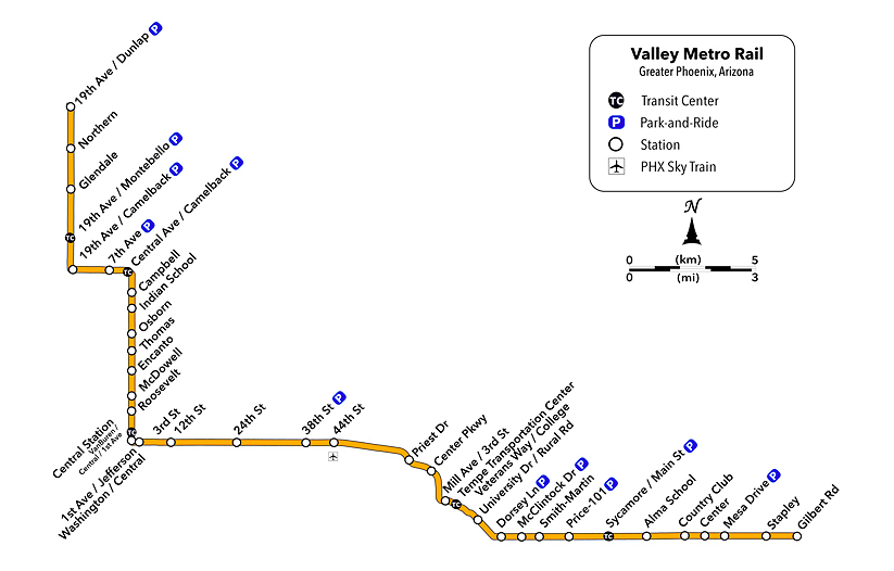 The Valley Metro light rail runs from east Mesa through Tempe to northwest Phoenix. An all-day pass is $4.