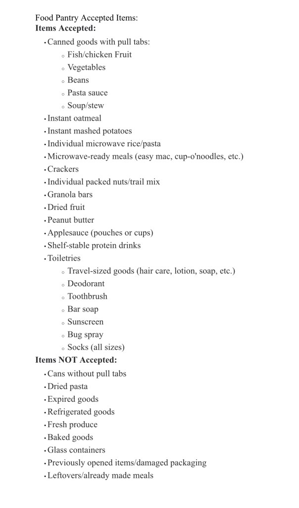 The food pantry serves Benedictine students in need. If you’d like to donate, please bring it to the Campus Ministry Office in Gillett Hall, Room 132. Pictured above are the food pantry’s accepted items.
