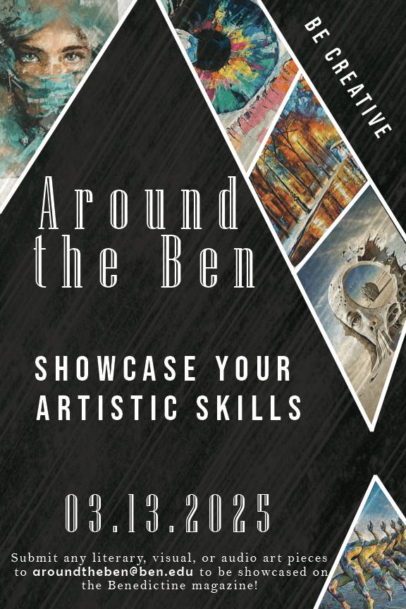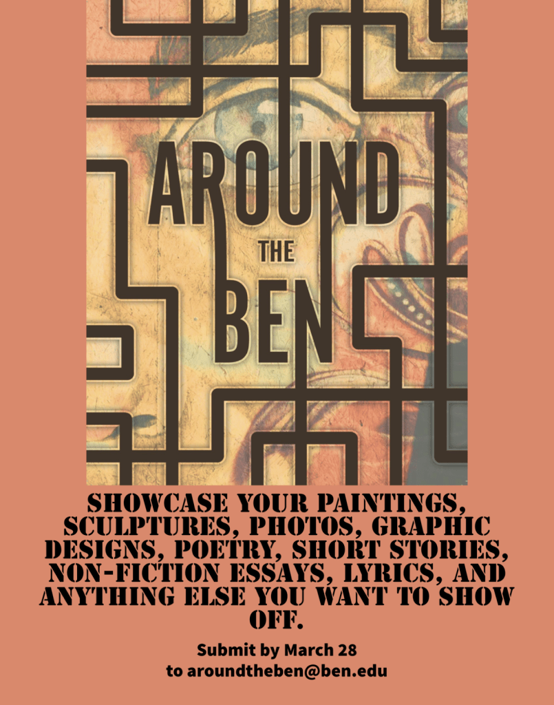 Ready to see your work published? Send your submissions to aroundtheben@ben.edu for a chance to be featured in our upcoming issue. Whether you’re submitting a thought-provoking poem, a stunning photograph, or a compelling short story, we can’t wait to see what you create! For more information, check out the website. Send your submissions by March 13.