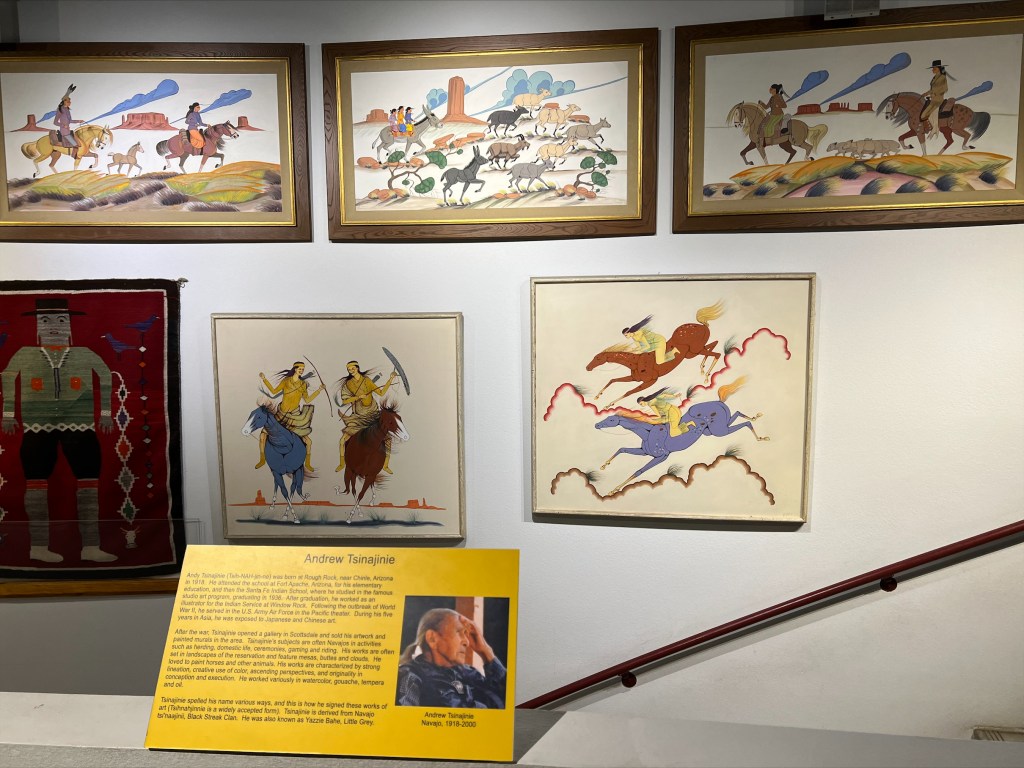 One section of the gallery is dedicated to one artist, Andrew Tsinajinie; he was a part of the Navajo Nation, and during World War II, he served in the Army Air Corps and was sent to the Pacific Theater. There he was exposed to Asian and Japanese art, and these art styles influenced his work.